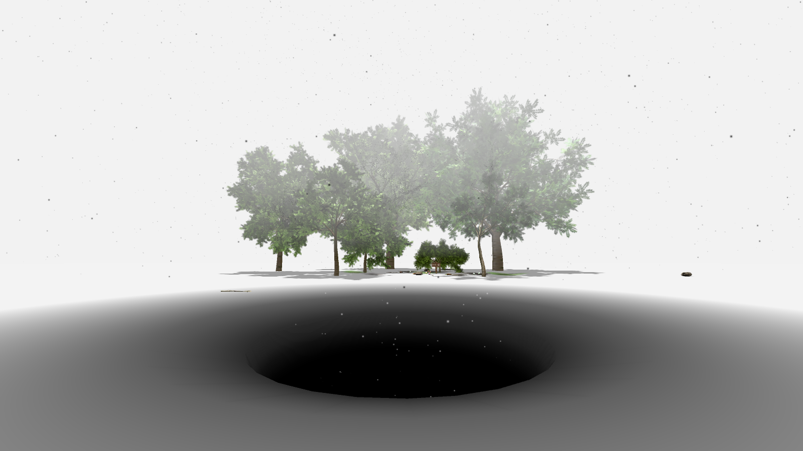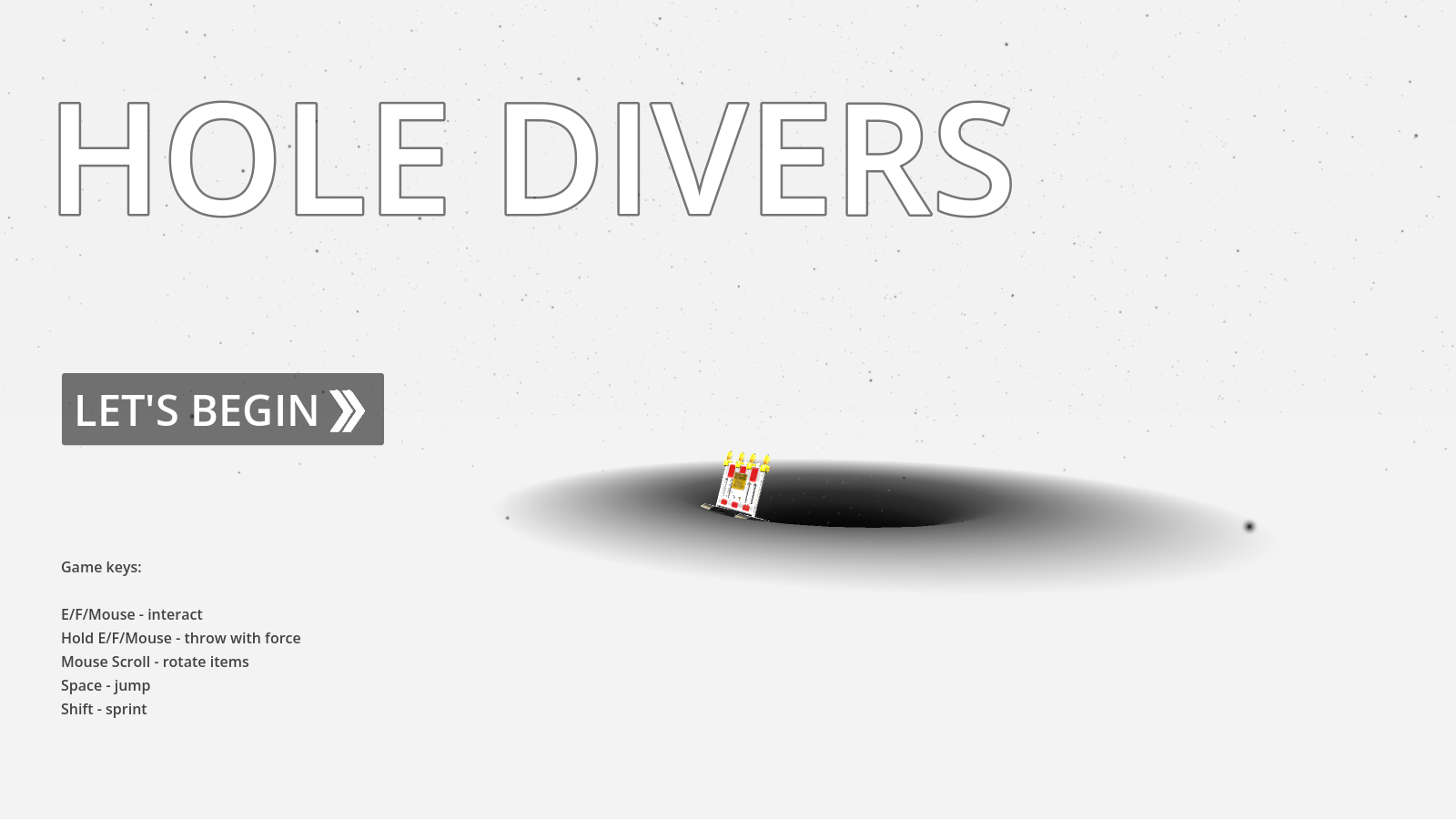 A surreal exploration game set in an endless white void with a single mysterious black hole. Entering it leads to an inverted world where colors are reversed and strange objects fall from the sky. Throw items into the hole to trigger new ones, uncover hidden mechanics, and slowly reveal the rules of this abstract universe. Some objects grant special abilities, like seeing invisible portals or hidden spaces. Through experimentation and curiosity, the player may eventually find a way to reach the final secret — a gateway into infinite darkness.